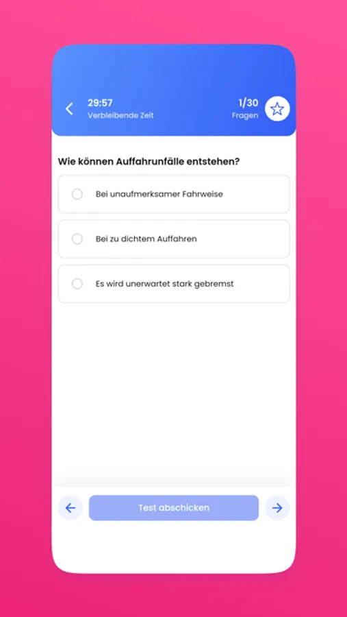 Mit unserer Führerschein App wird das Lernen für den Führerscheintest 2021 zum Kinderspiel. Unsere Führerscheinvorbereitung App hilft Ihnen dabei, sich optimal auf die Fragen des deutschen Theorietests vorzubereiten und die Führerscheinprüfung im ersten Anlauf zu bestehen. In zufälliger Auswahl können Sie den gesamten Fragenkatalog durcharbeiten und anschließend unseren Übungstest für den Führerschein unter realen Bedingungen durchführen. Ein Countdown stoppt die Zeit, während Sie die Fragen aus dem offiziellen Führerschein-Fragenkatalog 2021 beantworten. In der App können Sie den Übungstest unbegrenzt wiederholen und jederzeit auf vergangene Tests zugreifen, um zu sehen, wo noch Verbesserungsbedarf besteht. Zusätzlich zu den Theoriefragen können Sie mit unserer Führerschein App die Bedeutung sämtlicher deutscher Verkehrsschilder lernen, die der Übersichtlichkeit halber nach Kategorien sortiert sind. Wenn Sie zusätzlichen Lernbedarf haben, dann wechseln Sie zur Pro-Version unserer App und nehmen Sie an unseren Führerschein Videokursen teil, die Sie sicher und verständlich durch sämtliches Lernmaterial führen – die beste Hilfe, um ihren Theorietest 2021 zu bestehen.