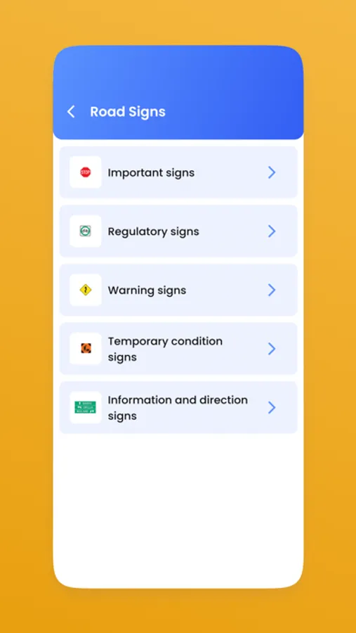 3. Road Signs – a full list of all relevant road signs, by categories.