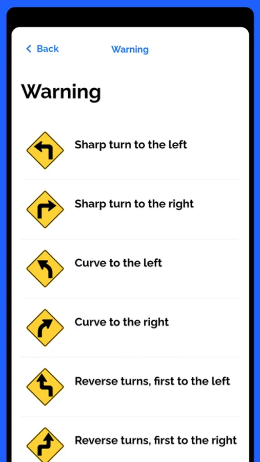 • A full list of all relevant state and national road signs.
