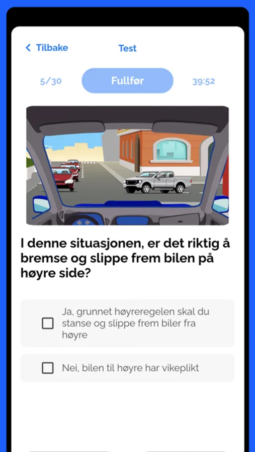 Teorieksamen er uavhengig av hvordan du lærer best en stressende dag og du trenger å være forberedt på alt, vi har derfor laget en simulator som gir deg samme følelse som om du skulle tatt den reelle teorieksamen. Du vil få en tidsbegrenset teorieksamen, forskjellen her er at du kan ta eksamen flere ganger for å bli vant til å ta eksamen på tid. Ikke nok med det så har du mulighet til å gå tilbake i tid for å se på tidligere prøver og gjøre deg kjent med eventuelle feil du måtte ha gjort for å forberede deg enda mer.