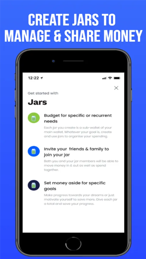 Jars are an easy way to organize your money separately for different things like utilities and shopping. Jars can also be shared as joint accounts to manage expenses with up to 5 people for group spending e.g. weddings, vacations