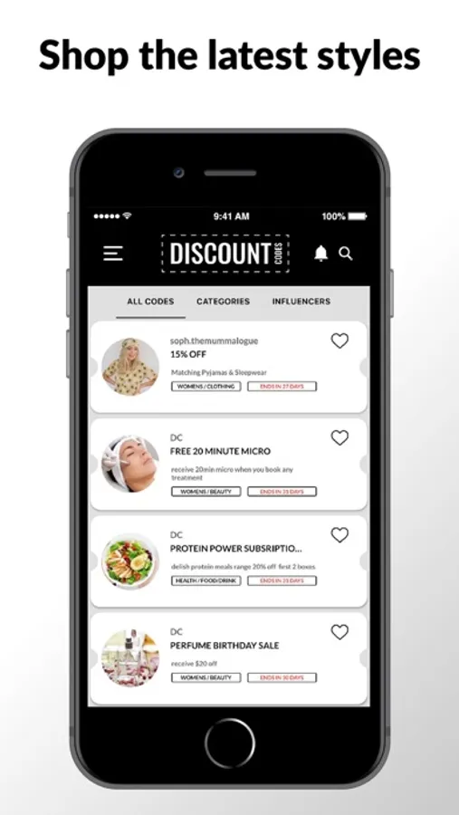 Never miss out on a discount again, create your own Favourites list and be notified by our notification feature. Receive an alert every time one of your favourite Influencer or Business adds a new code.