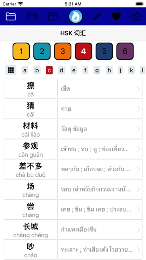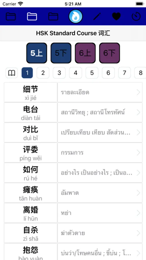 • App 收录了流行HSK教材和HSK备考(HSK标准课程,HSK标准教程)课程词汇表,包括蓝色5上5下和紫色6上6下。每本书都分为章节,并显示了详细的词汇表。