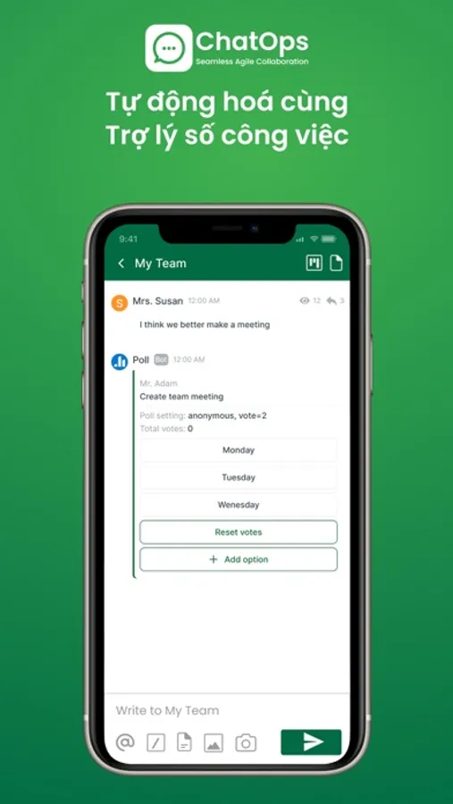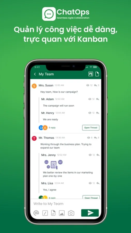"ChatOps - nền tảng cộng tác giao tiếp liền mạch hàng đầu doanh nghiệp, là không gian làm việc số. ChatOps cung cấp đầy đủ các tính năng giao tiếp giúp cho việc cộng tác công việc trở nên liền mạch, linh hoạt, đúng thông tin vào đúng kênh công việc, đúng người vào đúng thời điểm. Nền tảng thúc đẩy cộng tác giữa người-người và người-máy ứng dụng sâu AI và Machine Learning nhằm tăng cường tự động hoá, thông minh hoá công việc hướng đến việc khai thác dữ liệu phục vụ quá trình ra quyết định nhanh chóng. ChatOps cung cấp 4 tính năng chính: