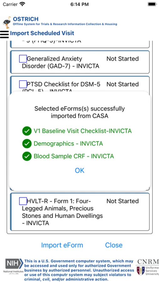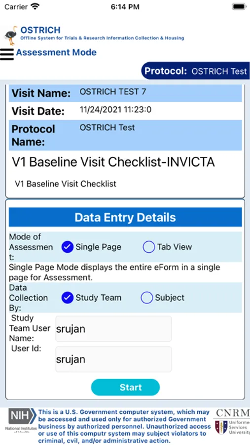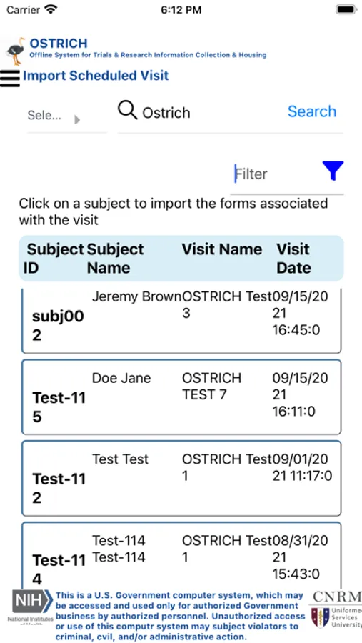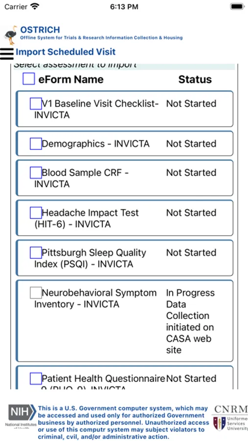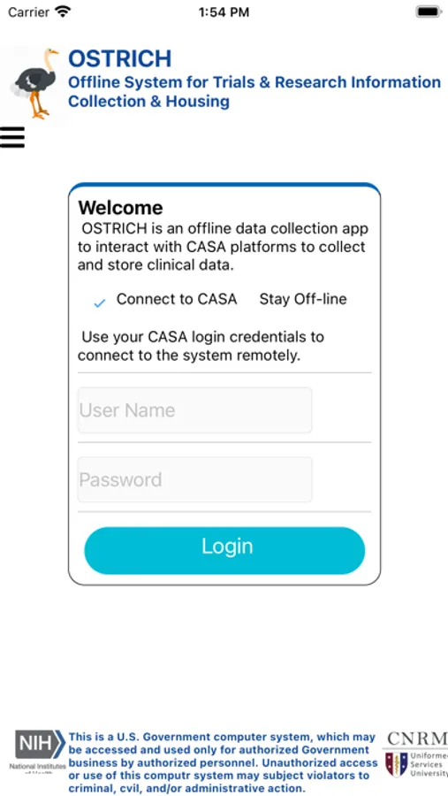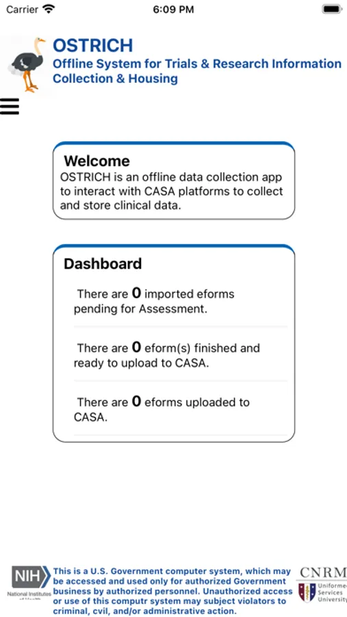 OSTRICH – Offline System for Trials & Research Information Collection & Housing: It is a mobile app to support clinical trials at NINDS designed to allow researchers to collect patient's clinical data with encrypted storage and allow to upload to the remote systems such as Clinical Informatics System for Trials and Research (CiSTAR) or The Center for Neuroscience and Regenerative Medicine (CNRM) when connected via internet. It has the ability to collect data for patient scheduled visits and other detailed protocols that are imported from main systems dynamically.