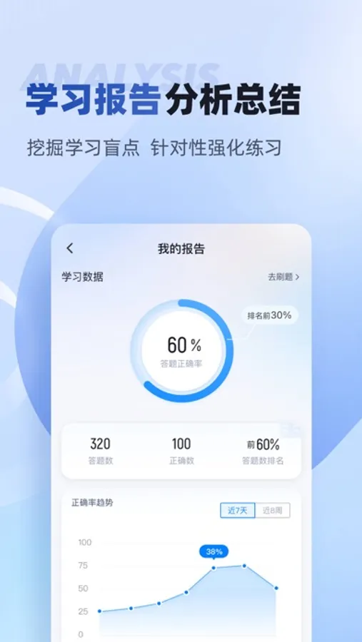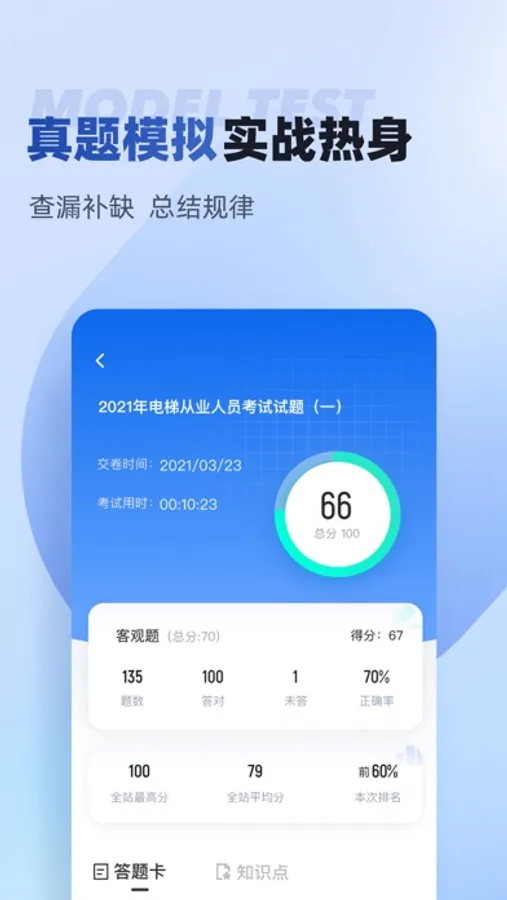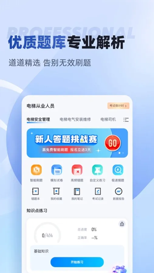 电梯操作员题库内含考点练习,全国通用卷以及地区卷模拟练习,以及按照固定考试比重的随机式的抽题的真题考场,成绩单实时记录考试数据,一点一滴的反馈考生近期学习状态以及自我正确率的提升,大大的给予考生通过考试的信心。