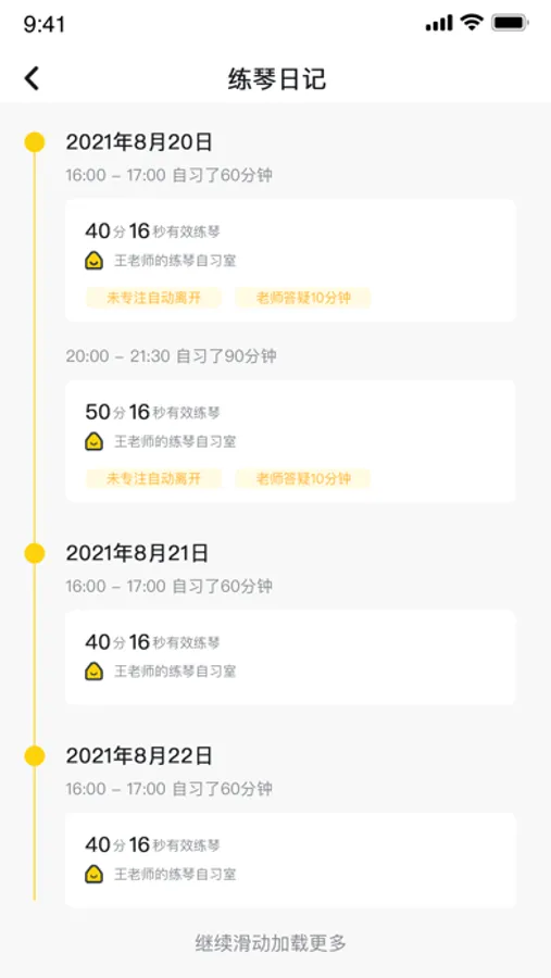 4.练琴报告与数据:自习室老师在答疑后填写练琴反馈单,系统也将随时记录孩子的练琴数据并形成成长报告,帮助家长及时了解孩子的练琴进度。