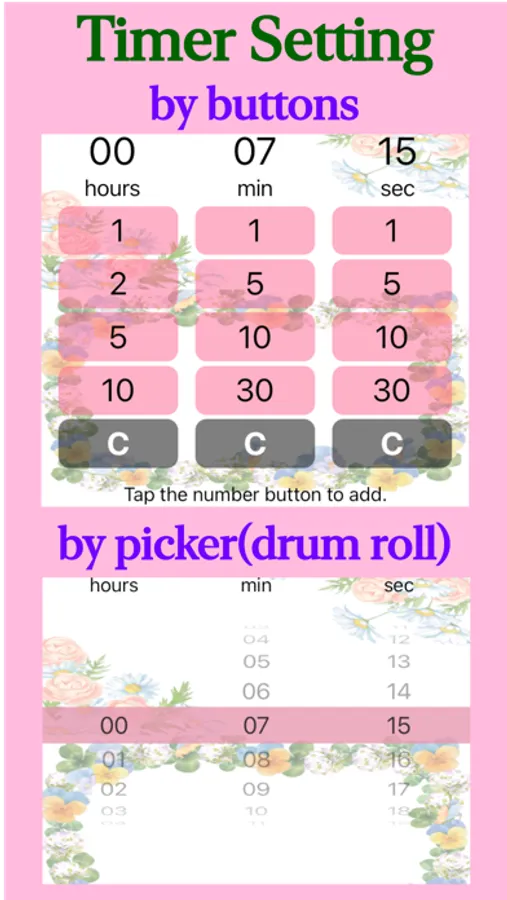 - Timer function and 2 types of timer time setting method (button tap & drum roll)