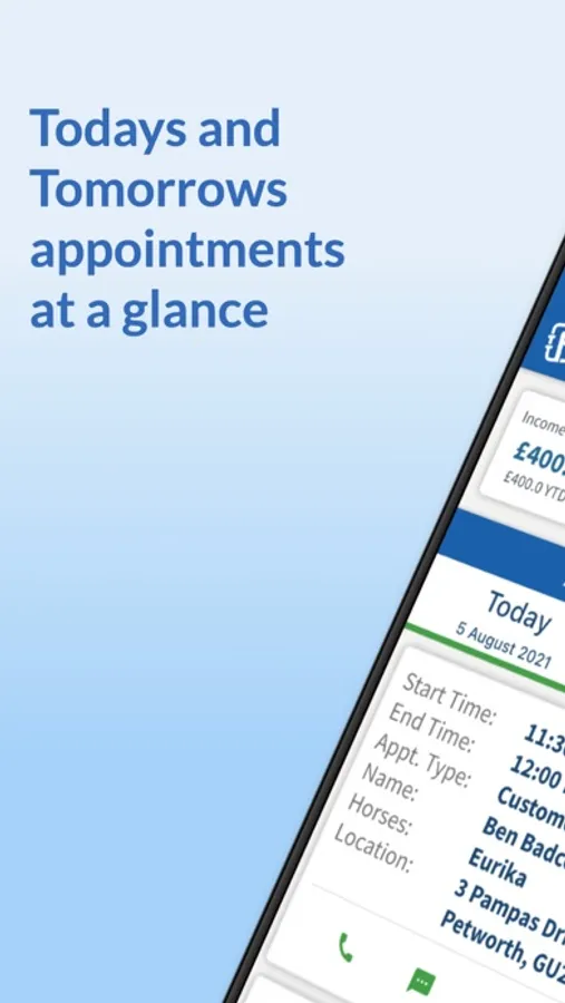 Home - A list of todays and tomorrow's appointments with one click navigation. Never waste time going to an appointment when your customer is not there. Monthly and yearly sales, list of outstanding invoices and reminders of horses needing appointments.