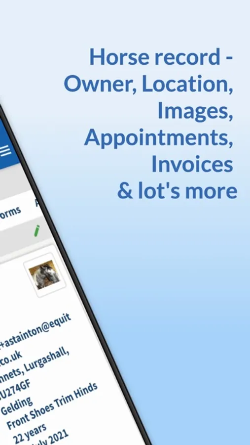 Horse records - A list of all of the horses you attend. Each horse record has details of the owner, horse's location and shoeing frequency. This could be at the owner's address, a field down the road or a Yard / Barn. You can store images, documents, video links and take notes. Also, see all of their appointments and invoices. Forms are a new feature. Create your own form in our web Form builder and complete on your App.