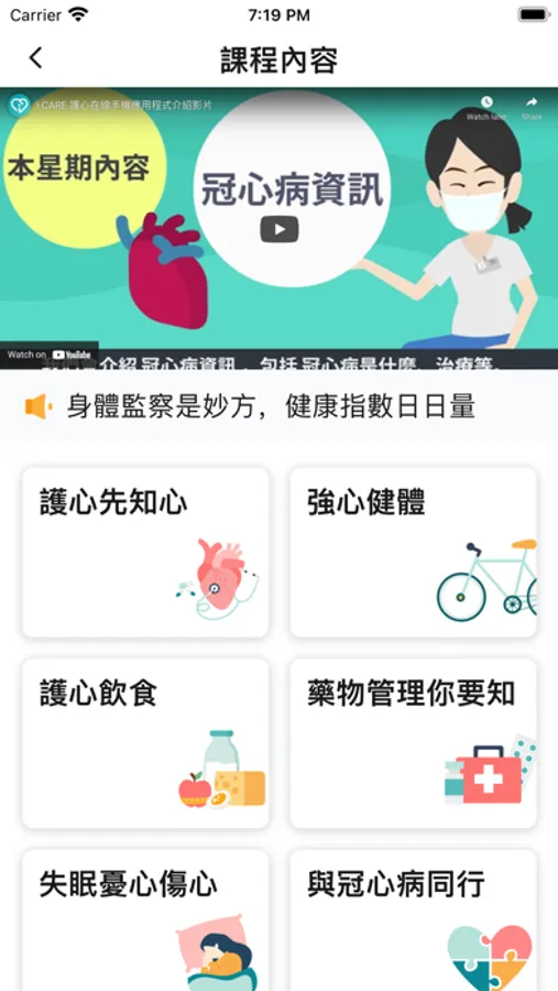 專為冠心病患者而設的手機程式「護心在線 i-CARE」由香港大學護理學院建立, 「護心在線 i-CARE」結合多個貼心功能,令使用者能更有效地自我管理病情及支援使用者自行監察健康指標。「護心在線 i-CARE」提供多項功能,例如: