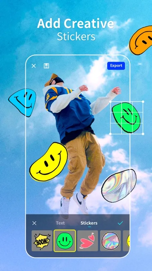 Make your video unique with exclusively designed stickers, emojis, hundreds of dynamic and static materials with themes for graffiti, birthday, pets, neon lights, and more.