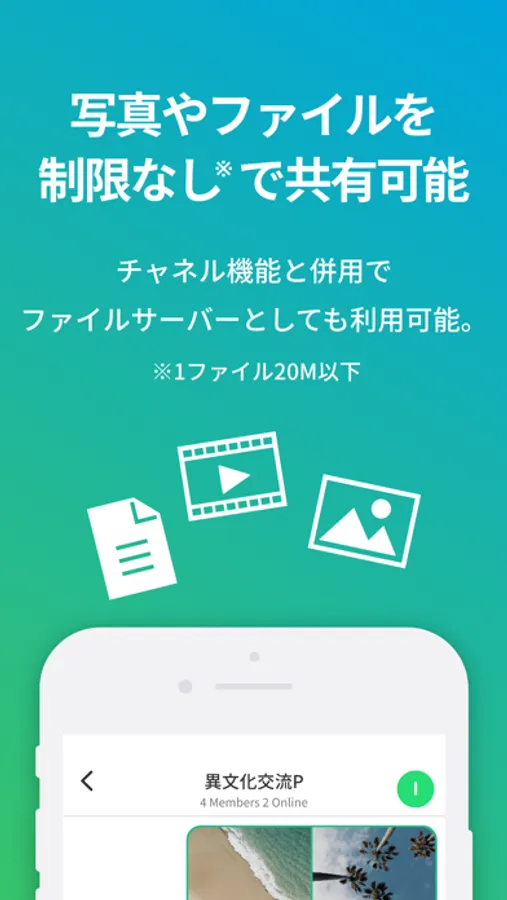 グループチャット、チャットチャネル、ファイル送受信、サーバー容量無制限。