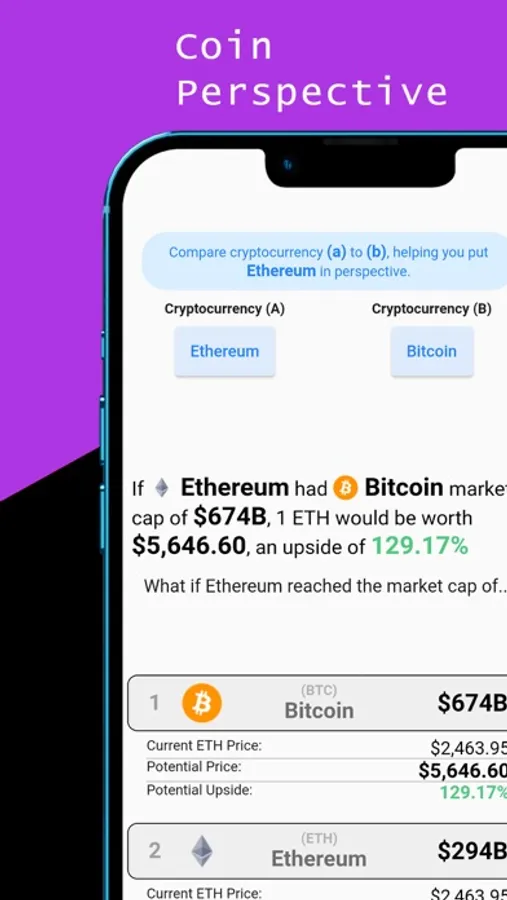 Perform cryptocurrency comparison and see the perspective. Compare if Ethereum were to reach Bitcoin's market cap, how much it would be worth, what profitability it offers and much more... You have more than 100 cryptocurrencies to compare different perspectives.