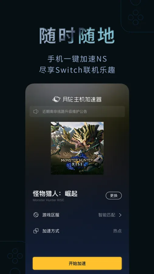 月轮主机加速完美支持手机热点switch下载和联机加速,有效解决开关游戏下载慢、掉线、卡顿等问题,你快速下载游戏,稳定畅快在线更新,无需等待,在户外商场,不需要其他硬件设备,你可以使用开关加速,利用手机热点或者wifi,让你随时随地畅享游戏的在线加速!