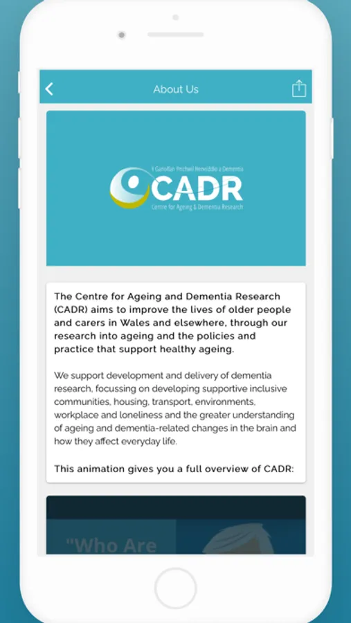 Lawrlwythwch ap y Ganolfan Ymchwil a Heneiddio Arloesol (CADR). Ymunwch â 'n cymuned i gyrchu ymchwil dementia ac ymchwil yn ymwneud â heneiddio o'r radd flaenaf, cael y diweddaraf am gyfleoedd cyfredol y gallwch gymryd ran ynddynt, yn ogystal â mynychu ein digwyddiadau rhad ac am ddim.