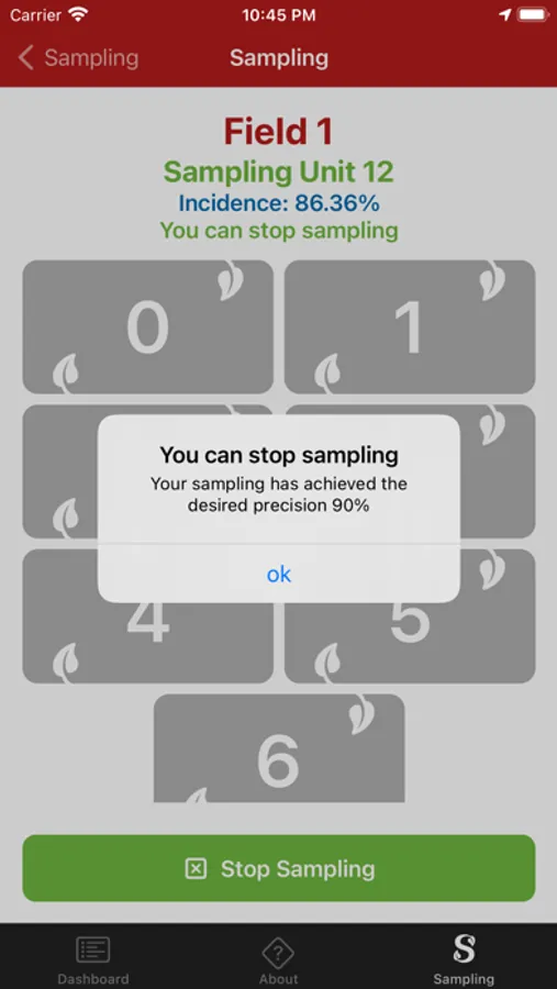 The app will inform the real-time incidence and if the information collected is enough to make a decision about the sampling procedure. At each sampling unit assessed, the app will run the pathosystem-specific algorithms and make a decision when to keep or stop sampling based on the goals and parameters selected. The sequential sampling plans algorithms were developed using the information on the spatial distribution of diseases published in science-based journals.