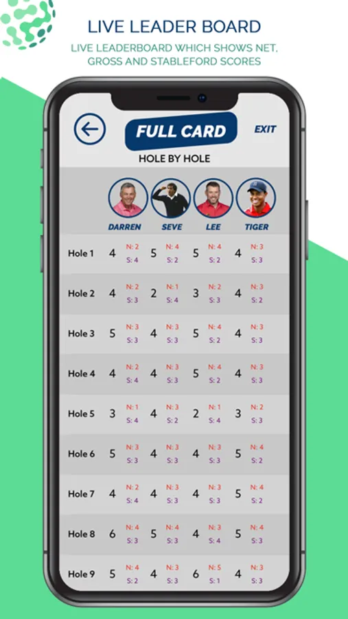 Score up to 4 players on your device, you can add manually or send a unique game code so they can score on their own device but track the leader board as the scores are entered.