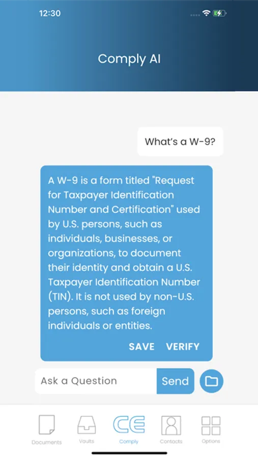 Embedded within the Comply Wallet App is our free to use market-leading mForms platform for submitting U.S. Tax Forms W-8, W-9 and Self-Certifications. This allows our partners to provide a readily available and a “no cost” digital facility to obtain electronic documentation. With integration into our Comply Administration product, we deliver real-time updates on documentation status and validity, directly into the app's interface.
