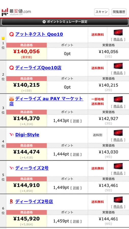 また、商品価格からポイント分を差し引いた金額(実質価格)でのランキング表示もできるので、最もお得な店舗をすぐに見つけられます。
