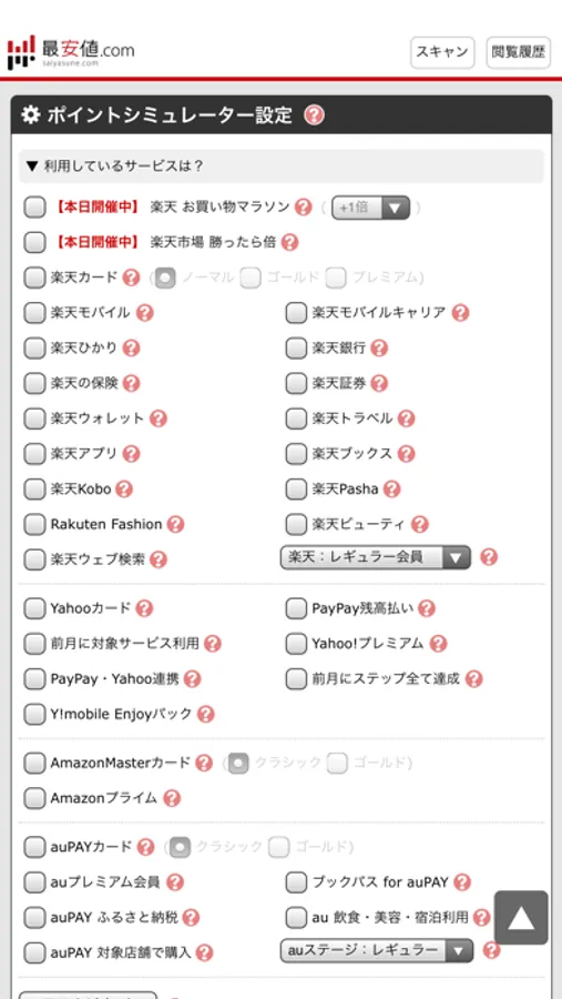 所有しているクレジットカードや、利用しているサービスにチェックをつけるだけで、それに応じたポイントを表示します!