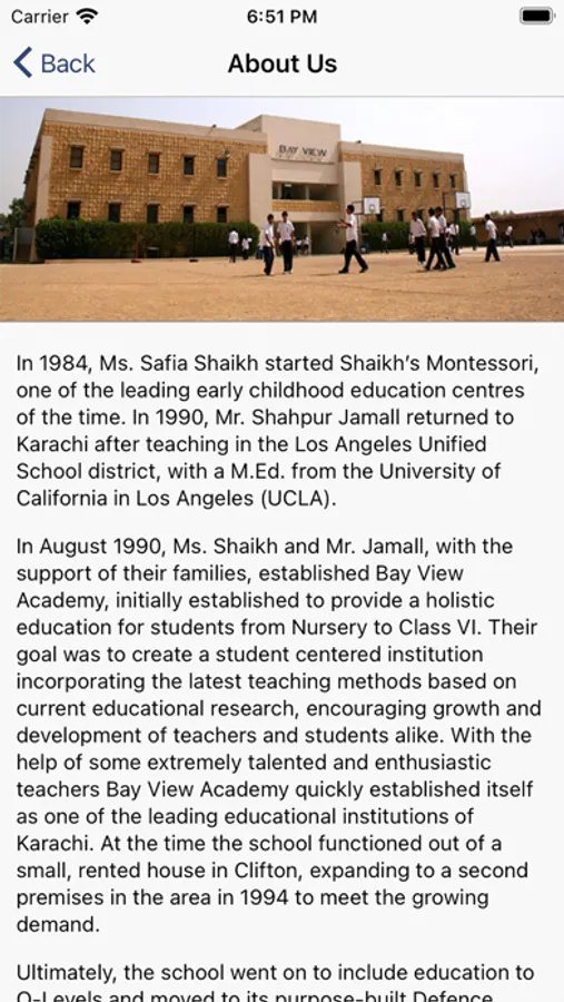 The school initially began as a Pre-Primary to Junior school, with classes from Nursery to Class VI, and the Senior School was established in 1999. In 2013, Bay View opened a new branch in Clifton followed by the PECHS branch in 2015. Bay View Academy currently has three campuses across the city with approximately 1600 students.
