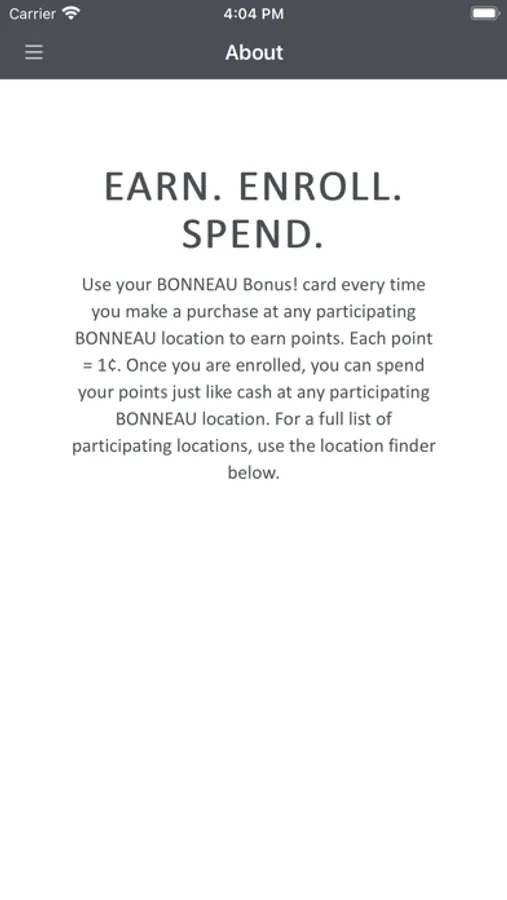 Use your BONNEAU Bonus! card every time you make a purchase at any participating BONNEAU location to earn points. Each point = 1₵. Once you are enrolled, you can spend your points just like cash at any participating BONNEAU location. For a full list of participating locations, use the location finder in the app.