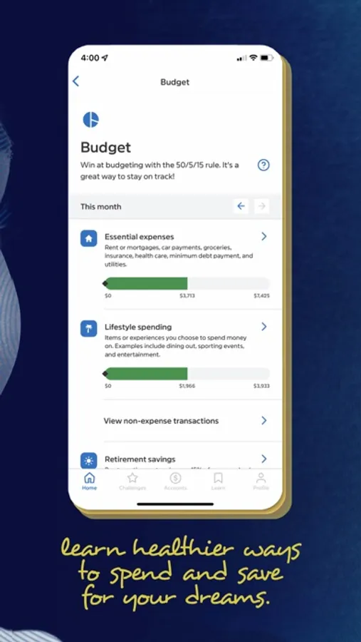 With your simple-to-follow target plan, you’ll be able to better oversee your retirement funds, budgeting, emergency savings, and even insurance coverage -- right from your phone. Complete weekly and monthly spending challenges designed with guidance and backed by the knowledge and experience of financial professionals. You can even sync bank accounts, credit cards, and loans to get a more accurate view of all your finances in one convenient place.