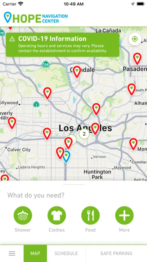 Hope Navigation Center is a free resource guide, designed as an app and a desktop website, that helps to geo-locate available services such as food, clothing, and showers in Los Angeles. It is for both people in need and people helping the most vulnerable population in Los Angeles. We post locations that serve food, clothing, mobile showers, and Safe Parking, among others.ing, among others.