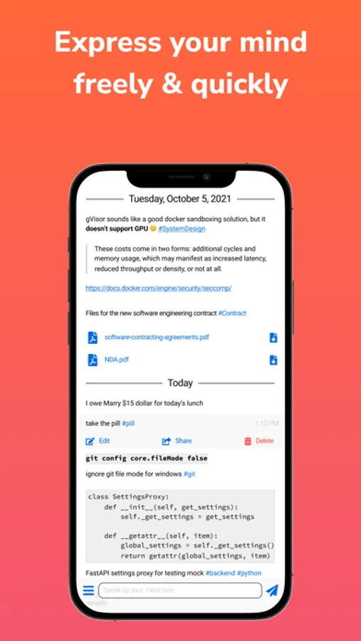 - Express your mind freely and quickly: Forget about the complicated note-taking apps. Just write everything that’s on your mind as a message freely and quickly.