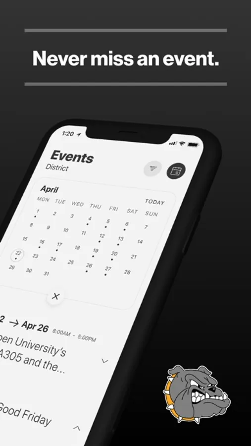 The event section shows a list of events throughout the district. Users can add an event to their calendar to share the event with friends and family with one tap.