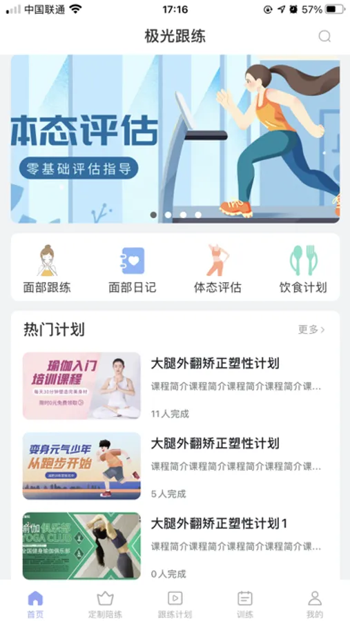 极光跟练-针对女性常见的体态问题,提供专项改善计划,例如各种腿型问题、斜方肌、头前伸、溜肩驼背、一字肩、天鹅臂、马甲线、瘦腿、假胯宽、臀部下垂、扁平足等,让你在家就能完成塑身目标。