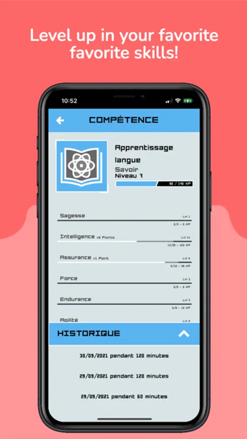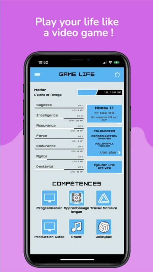 Enter your sports, arts, jobs, classes, daily life and relaxation activities to gain experience, to level up in real life, to become more motivated, better organized... In short, to become better.