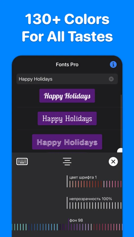 Each font can be flexibly customized: change color, transparency, alignment, add color substrates. More than 130 colors available.