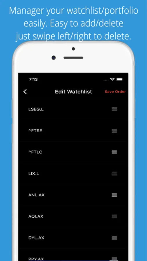 - Customizable list with ability to remove, add, re-order stock symbols.