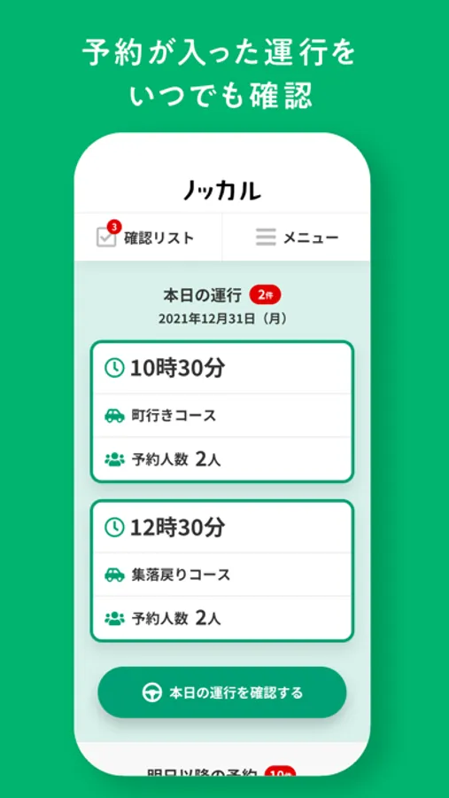 住民同士の助け合いの公共交通サービス「ノッカル」のドライバー用アプリです。シフトの入力や、予約情報の確認、事前点呼などの運行管理など、様々な機能が1つにまとまっています。