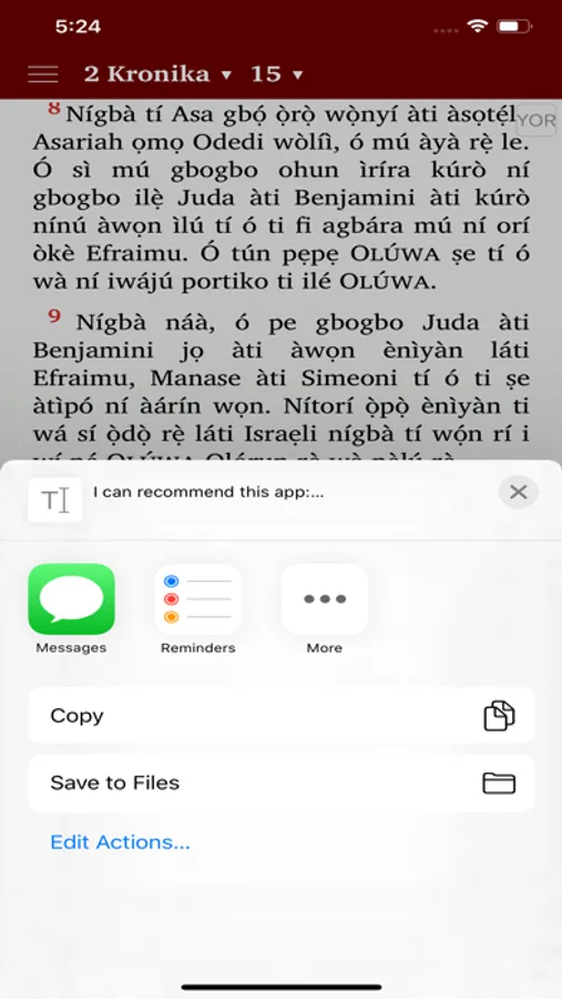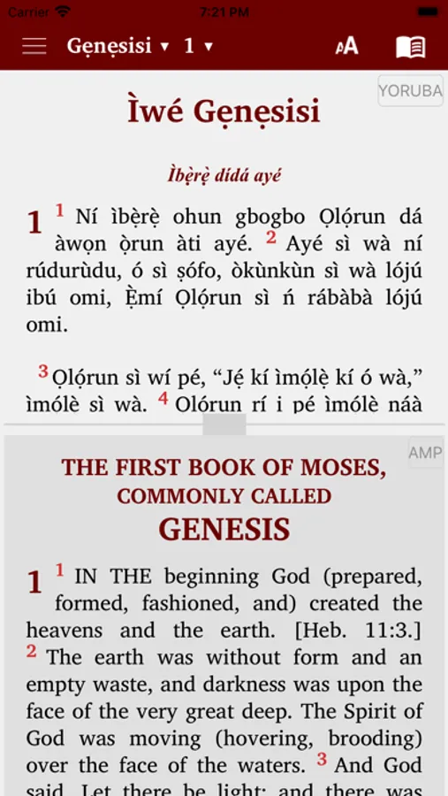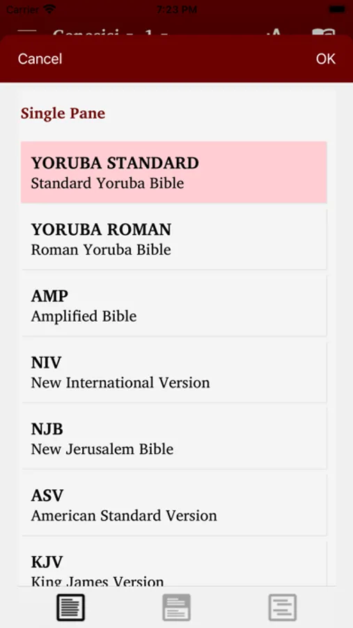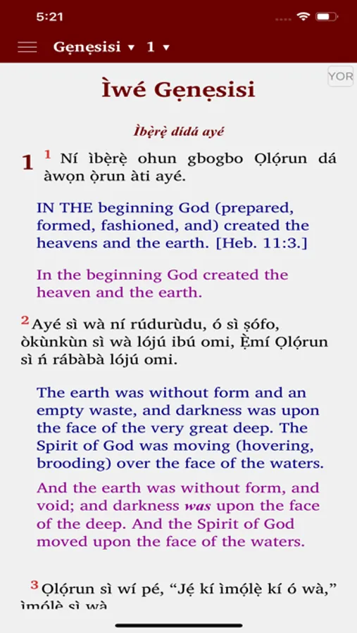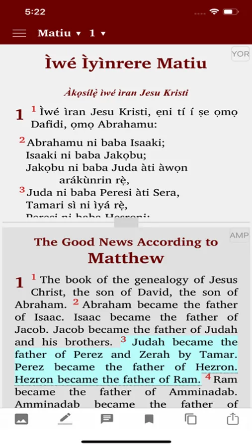 The Yoruba & English Bible is a multi-translation bible study app with 9 translations and counting, it include the standard Yoruba Bible and Roman Catholic Yoruba Bible plus other versions. The simple design allows you to read concurrently 2 or 3 translations at the same time with auto scroll upon navigation of any active book.