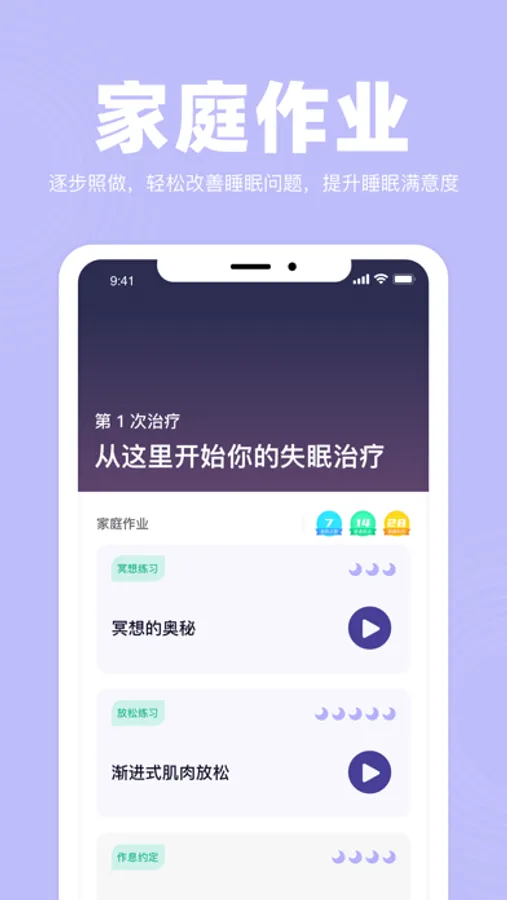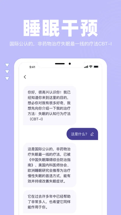 如眠是一款用于治疗慢性失眠的数字疗法软件,依据失眠的认知行为疗法(CBT-I)研发,以模拟现实中面对面的CBT-I治疗方式来实现治疗。