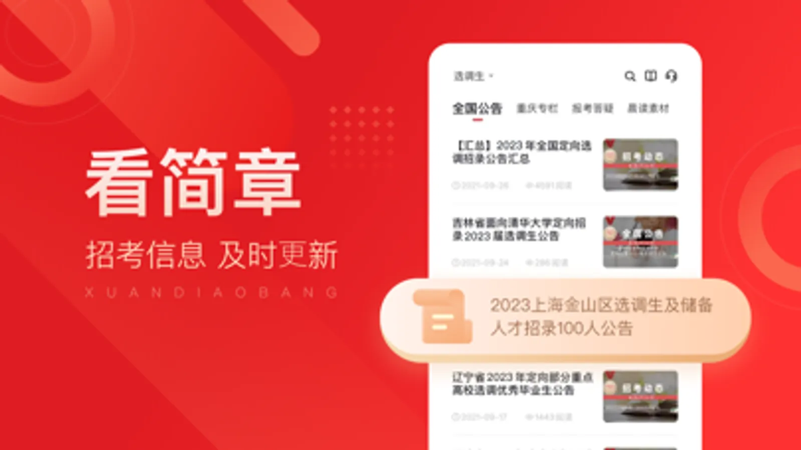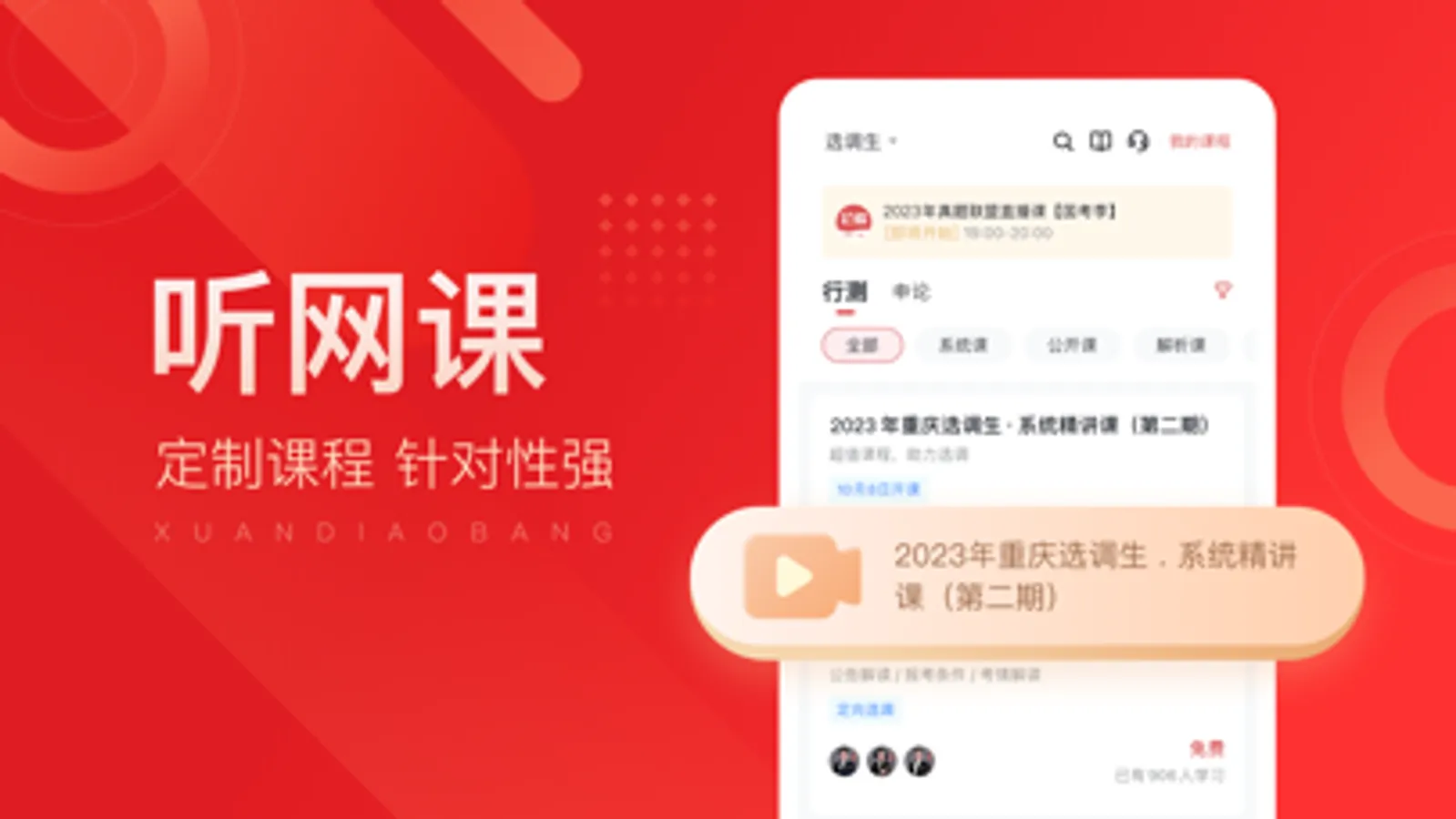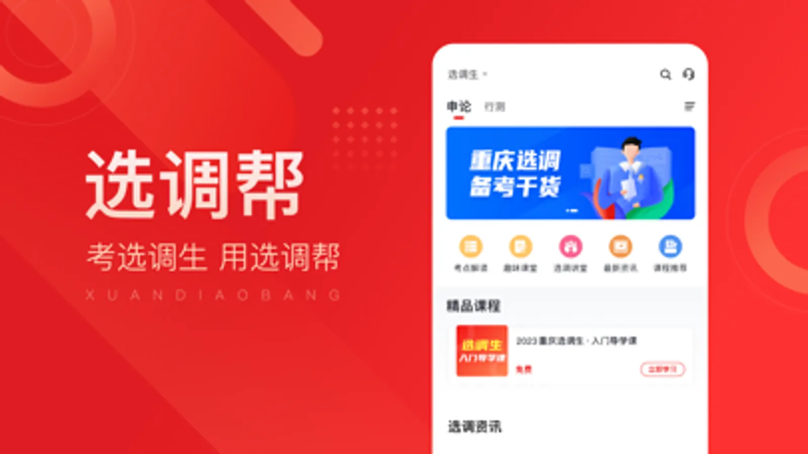 “选调帮”是专为选调生招录考试设计的手机APP,软件集精品课程、招考资讯、系列图书为一体,致力于向用户提供优质、高效、个性化的在线培训服务。
