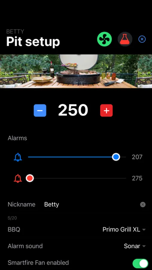 - Setup Your Pit screen enables you to dial in your desired target pit temperature, along with high and low threshold alarms and a fan override switch.