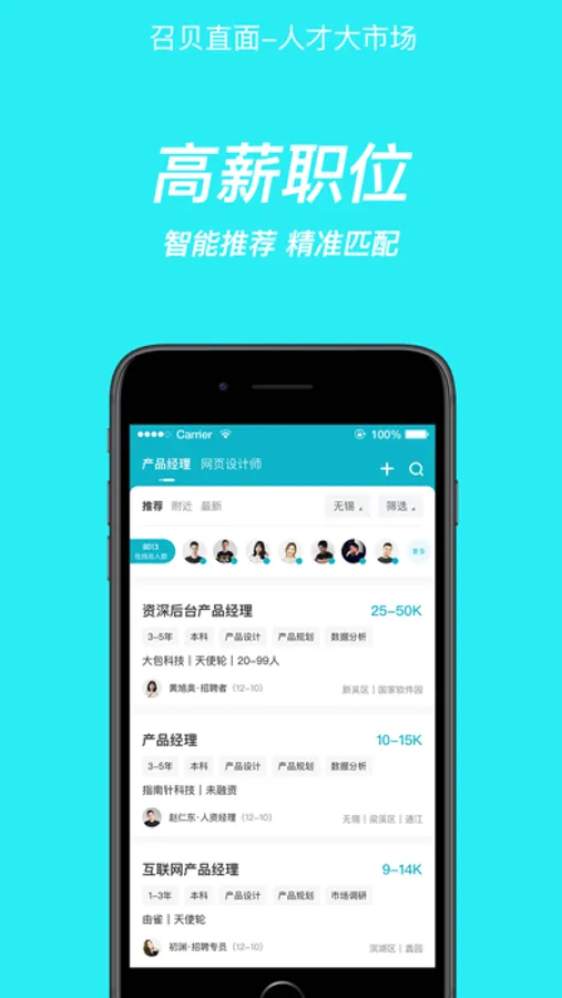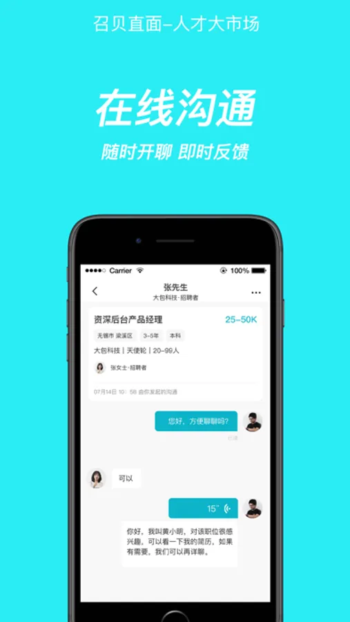 求职者与招聘者精准匹配,告诉查看。随时随地,直接开聊。