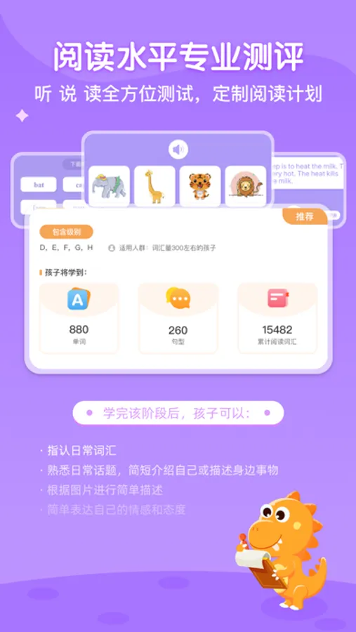 通过定级测试,精准定位孩子当前水平并推送对应难度绘本(含8大测试题型、9组45道题库)。另有30次阶段测试,让孩子随时学随时测。