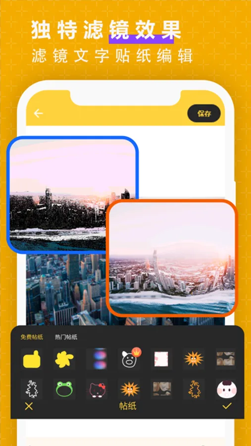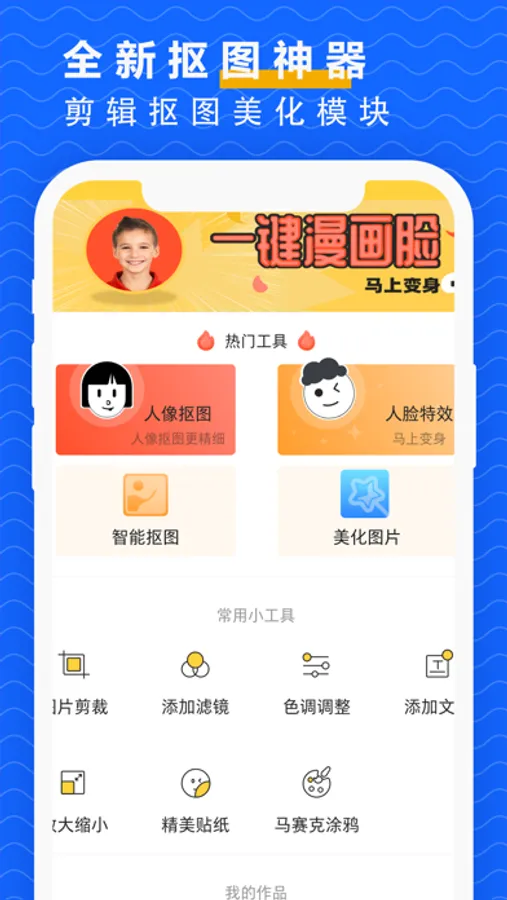 抠图P图随意裁剪照片、照片色调调整、照片美化、多款添加滤镜、各种精美贴纸、图文字添加等。