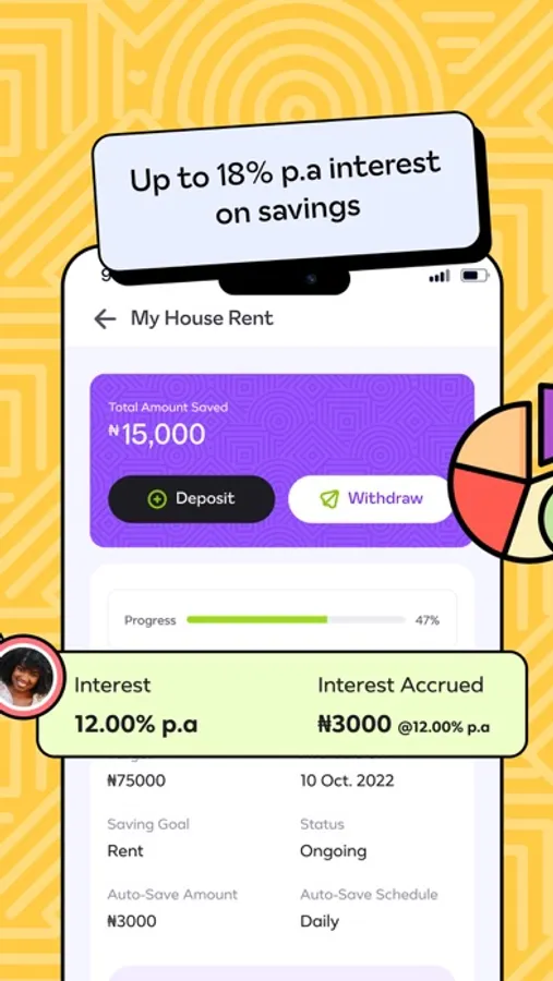 You can also save with regular deposits, set up savings goals with up to 18% interest per annum, and track your progress. Our app's security features make sure your money is safe and secure.
