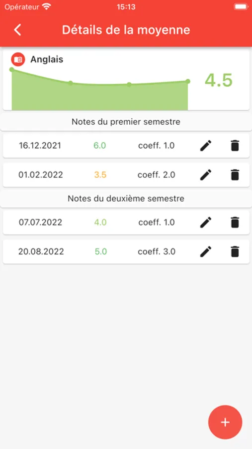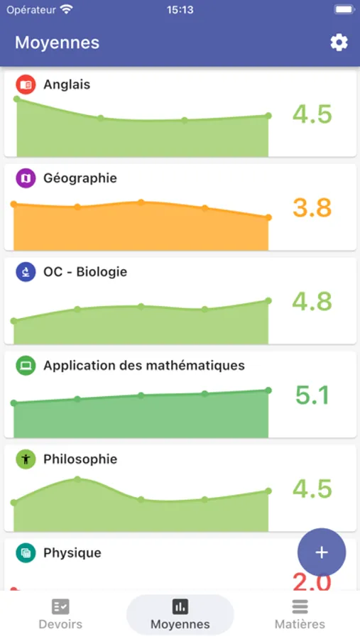 Mon Année Scolaire fournit un gestionnaire de notes. Il est possible de rentrer un coefficient et une date en plus de la note. Cela permet de calculer les moyennes pour chaque matière et les afficher sous forme de graphiques.