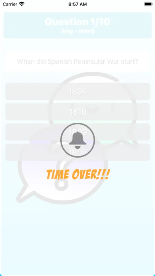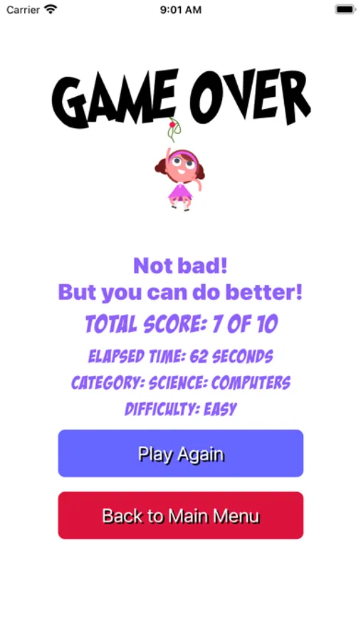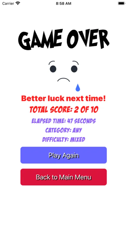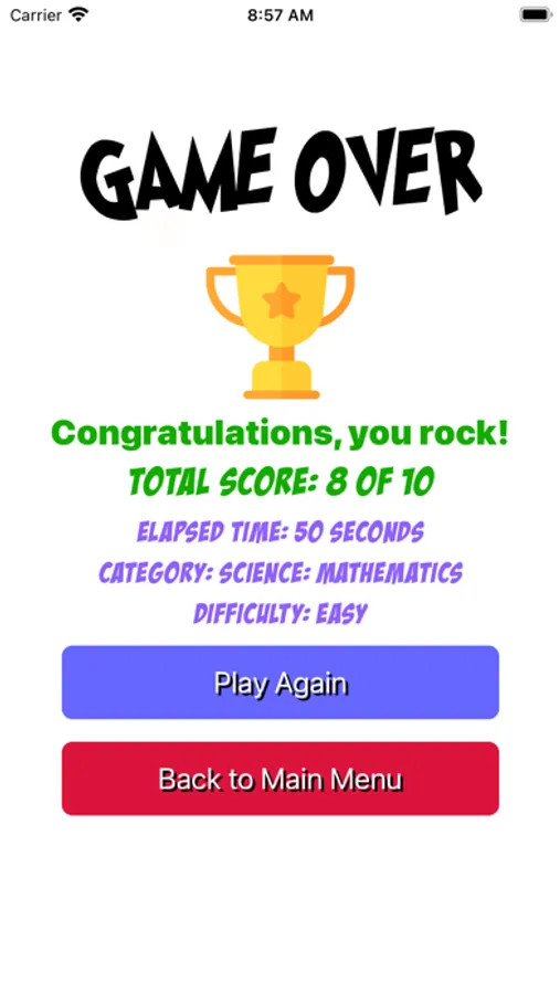 - When all questions are answered it shows the game over screen with total score and elapsed time