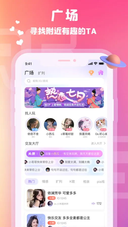 在这里,你可以随时找到心仪的人聊天,彻底赶走孤单,摆脱单身。也可以随时找到兴趣相投的小伙伴,结交有趣的灵魂。
