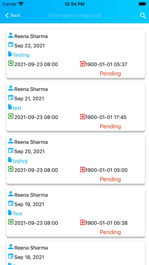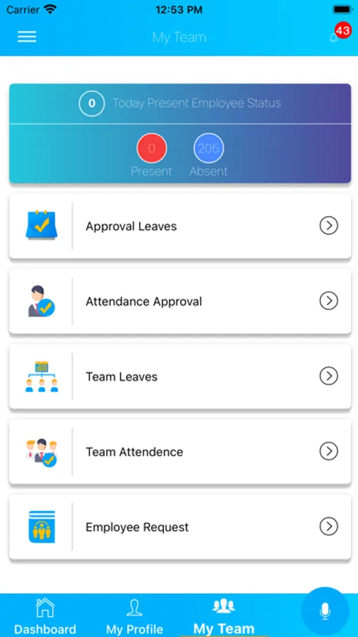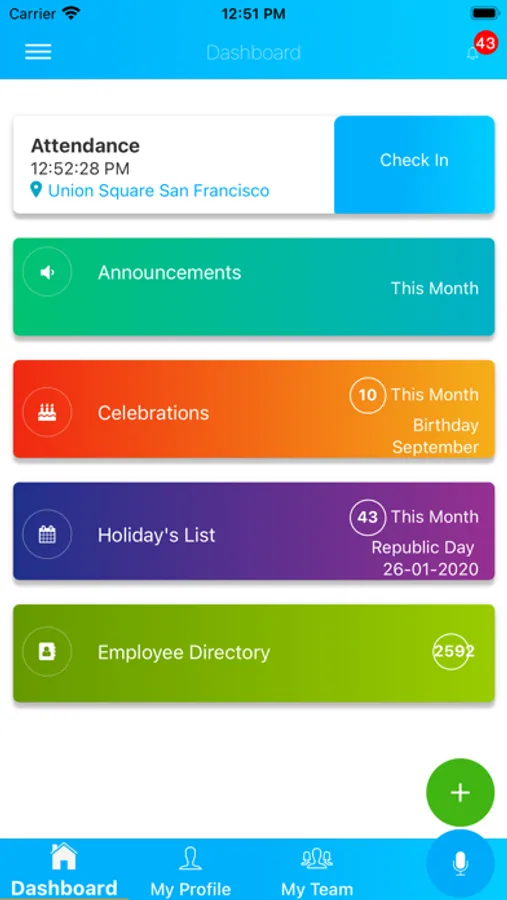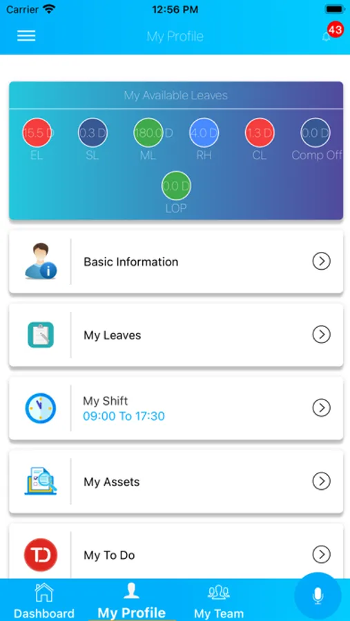 2. Based on login credential or after login, user can view own profile, details related to employee i.e. leave balances, Attendance check-in/out with attendance view, directory of teams with contact details.