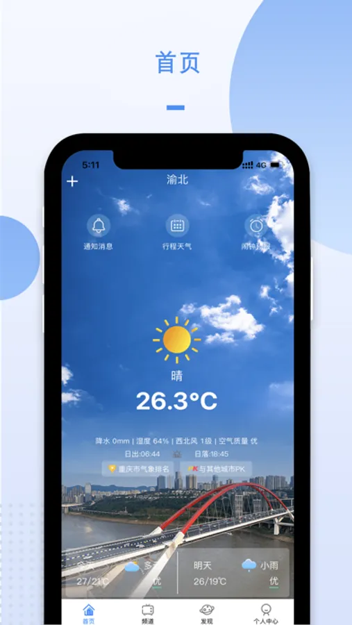 重庆天气服务APP是一款面向公众的天气信息查询服务软件,能实现基于用户行为分析和订制化需求的精细服务推送,帮助公众更好的面对各类天气状况。服务内容包括:气象灾害预警信息、基于位置的精细化天气预报、实况天气、天气视频、云海夜雨星空等景观预报、各类天气资讯、气科普象知识、优质气候旅游地和优质气候农产品智能推荐、行程天气订制、天气闹钟等。