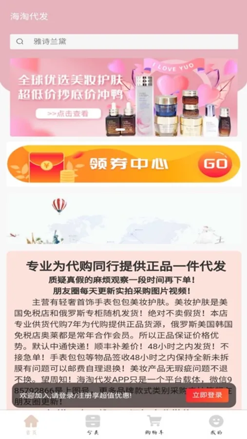 主营有轻奢首饰手表包包美妆护肤。美妆护肤是美国免税店和俄罗斯专柜随机发货!绝对不卖假货!本店专业供货代购7年为代购提供正品货源,俄罗斯美国韩国免税店奥莱都是常年合作会员。所以正品保证价格优势。默认中通快递!顺丰补差价!48小时之内发货!不接急单!手表包包等物品签收48小时之内保持全新未拆膜有问题可以邮费自理退换!美妆产品无瑕疵问题不退不换。望周知!海淘代发APP只是一个平台载体,微信985792866是上图号,更多品牌款式类别采购实拍等都在朋友圈更新!